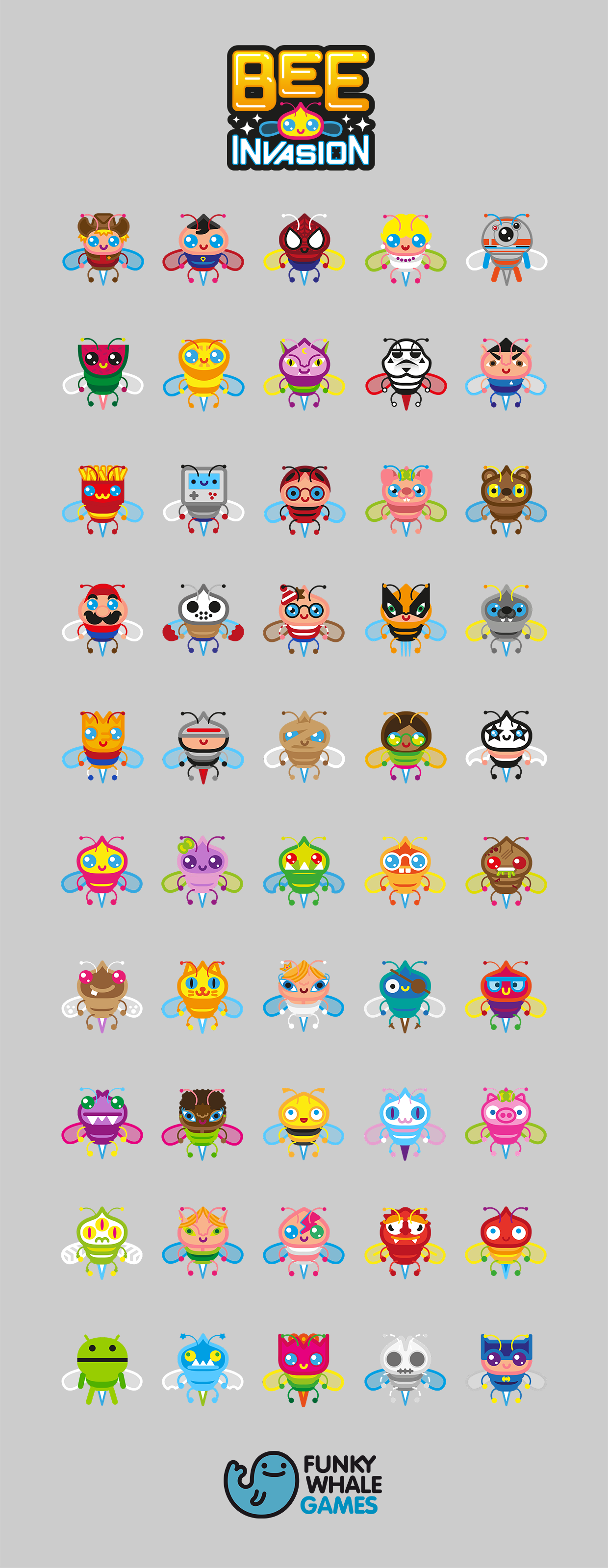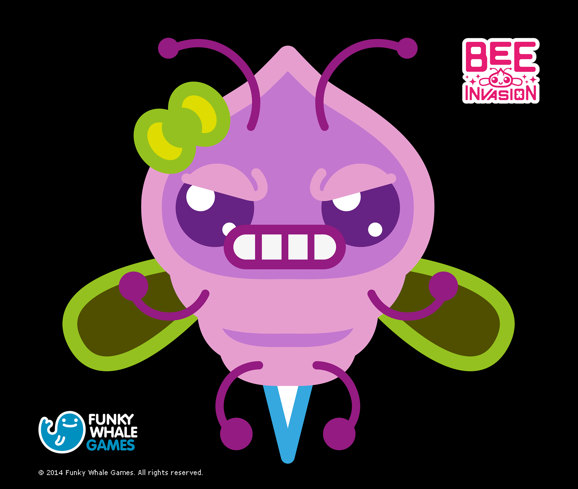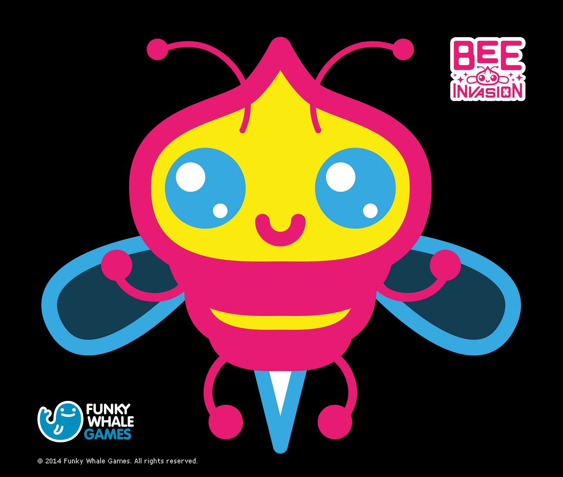 Character desing, animations, logo design, UX & UI design for BEE Invasion game. A Google Glass, Epson Moverio & iOS game developed by Funky Whale Games. Kawaii style.